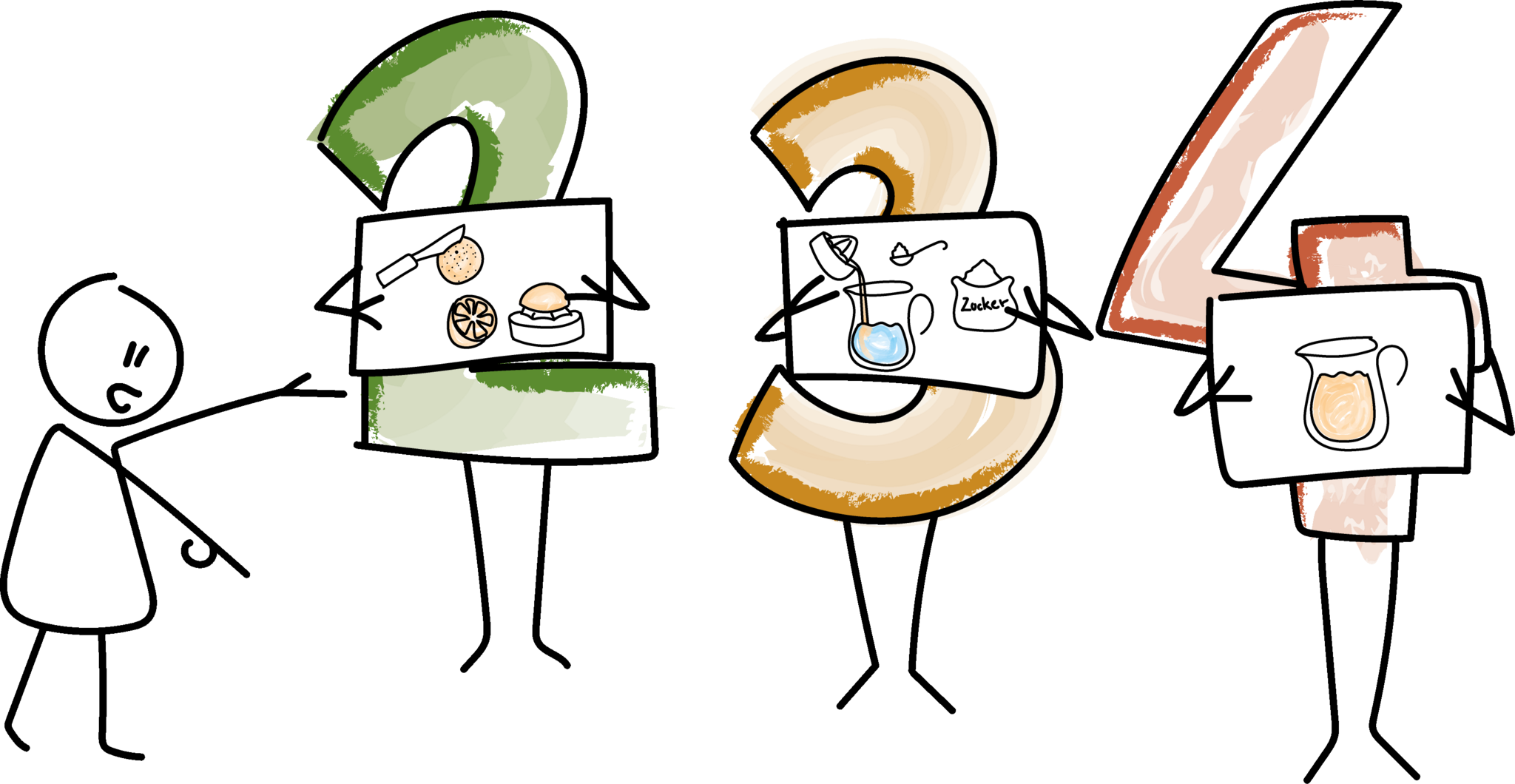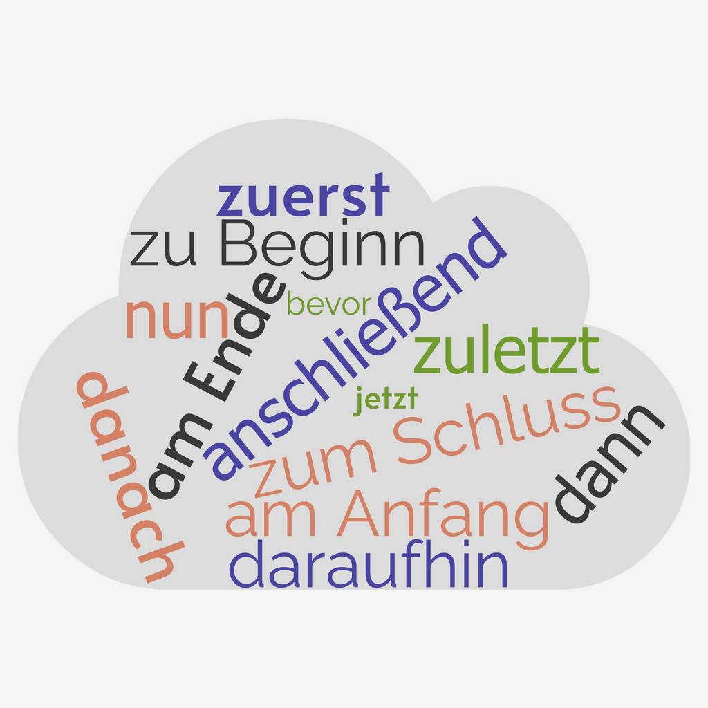 Wenn du die Schritte in ganzen Sätzen aufschreibst, solltest du auch mit Wörtern die Reihenfolge der Schritte zeigen. Verwende dafür Wörter wie zuerst / zunächst / zu Beginn, dann, daraufhin, nun, am Ende / zuletzt.